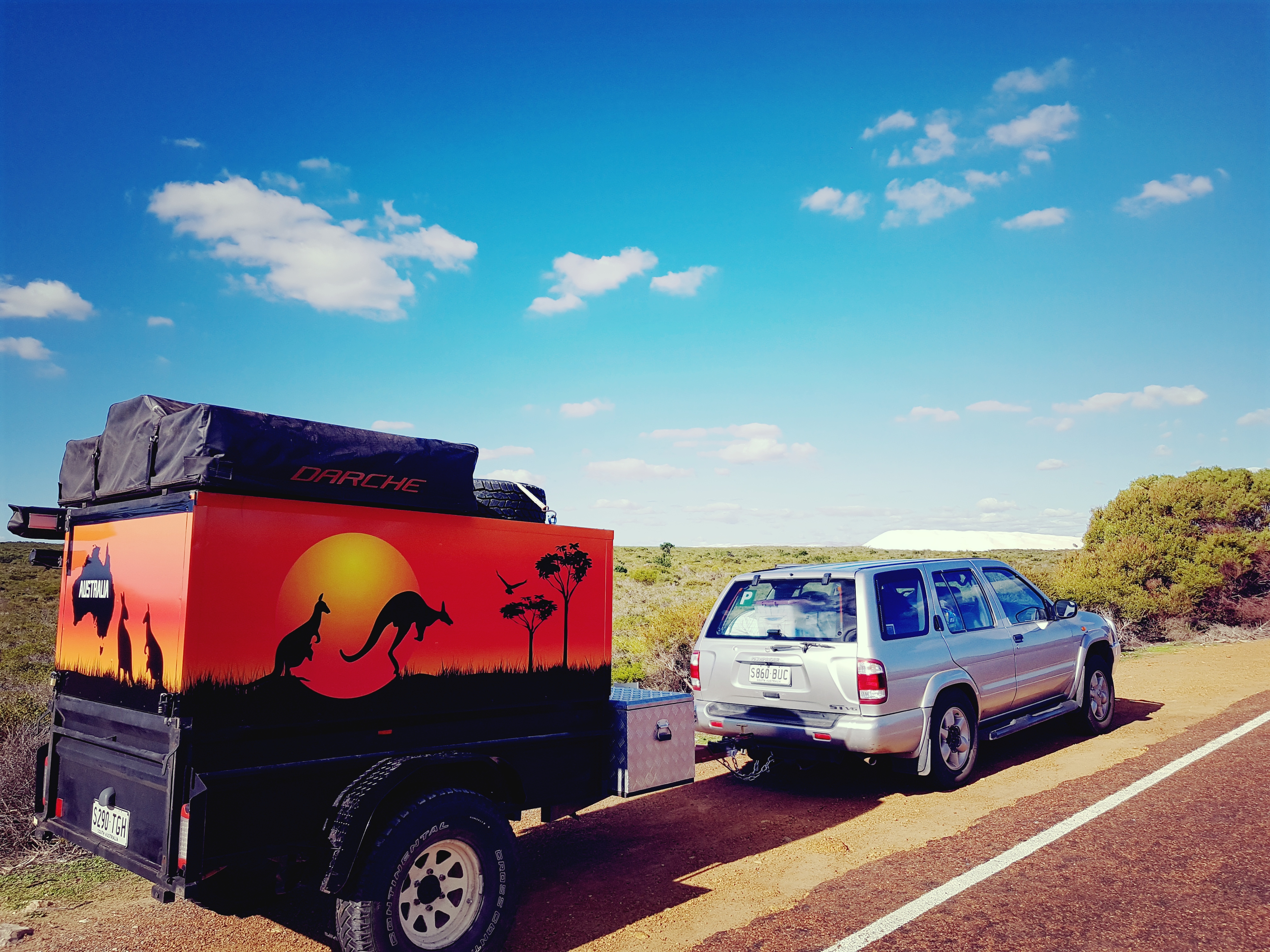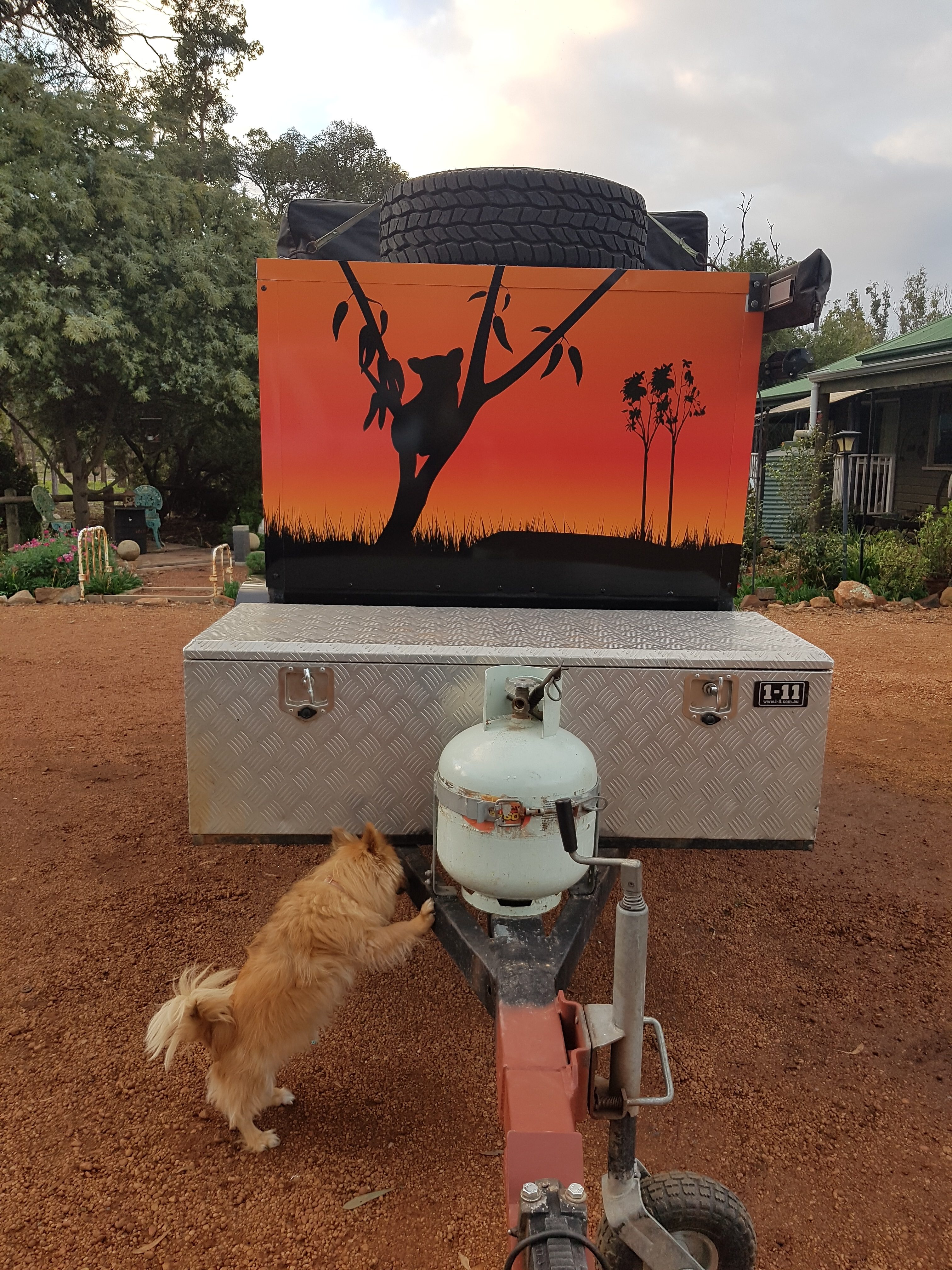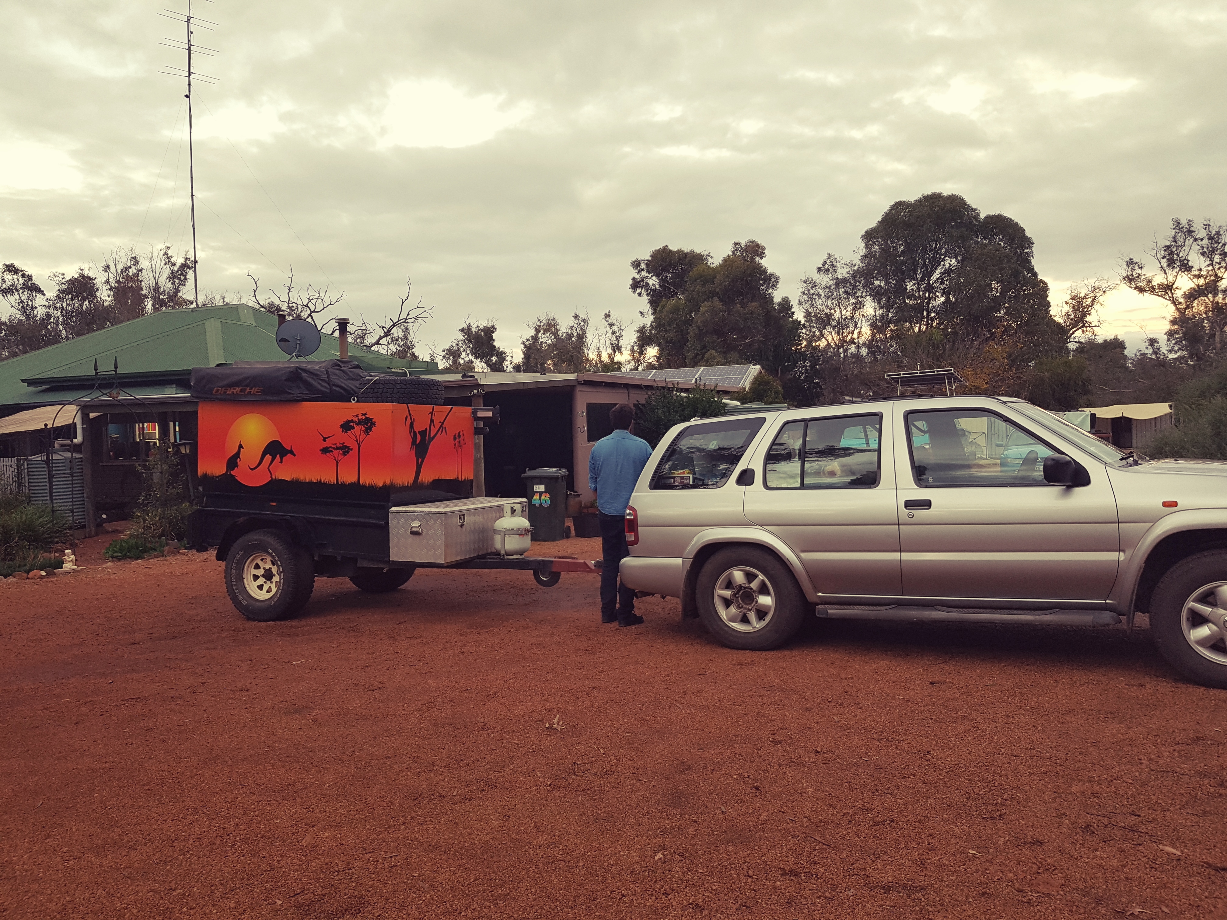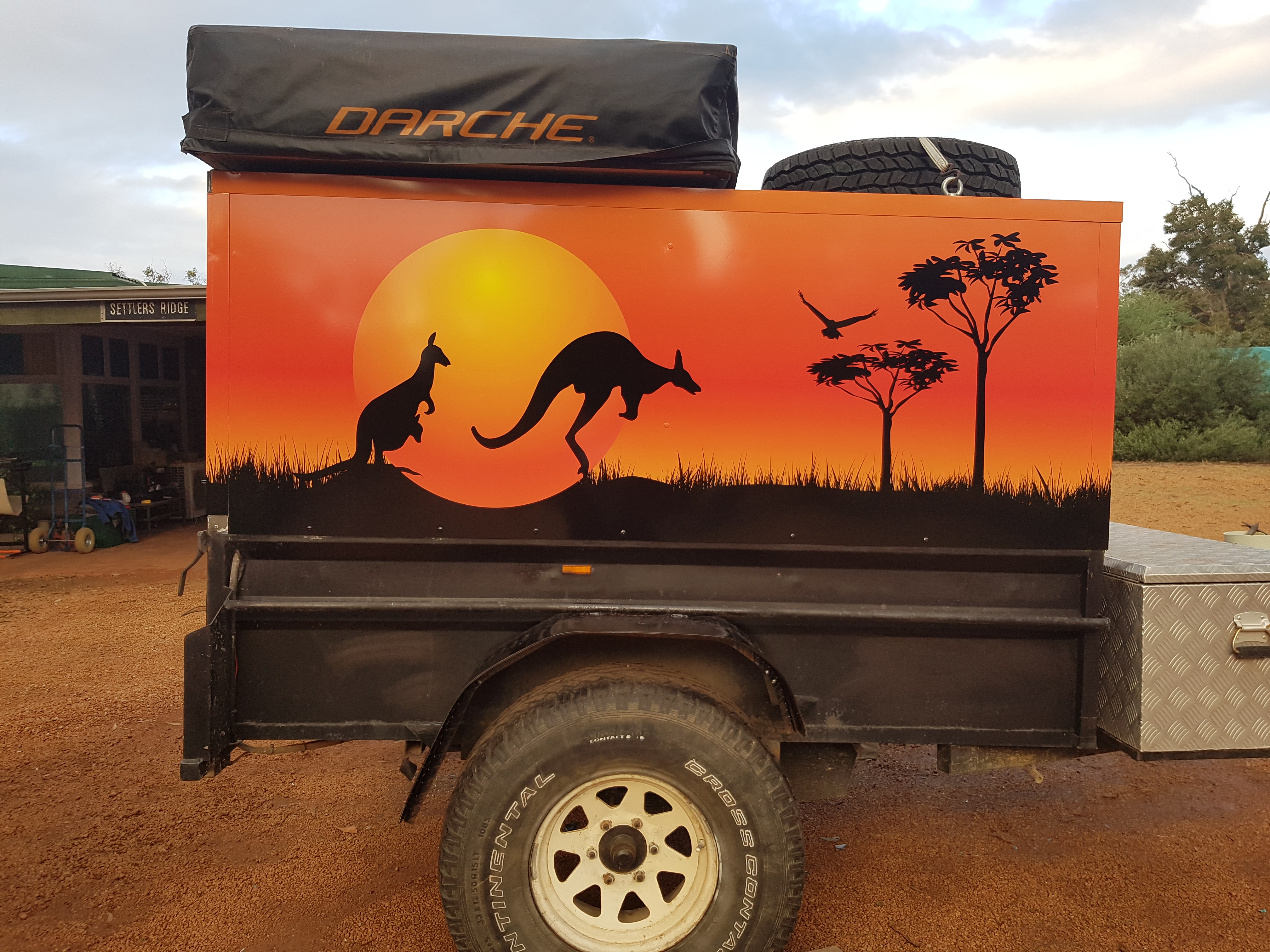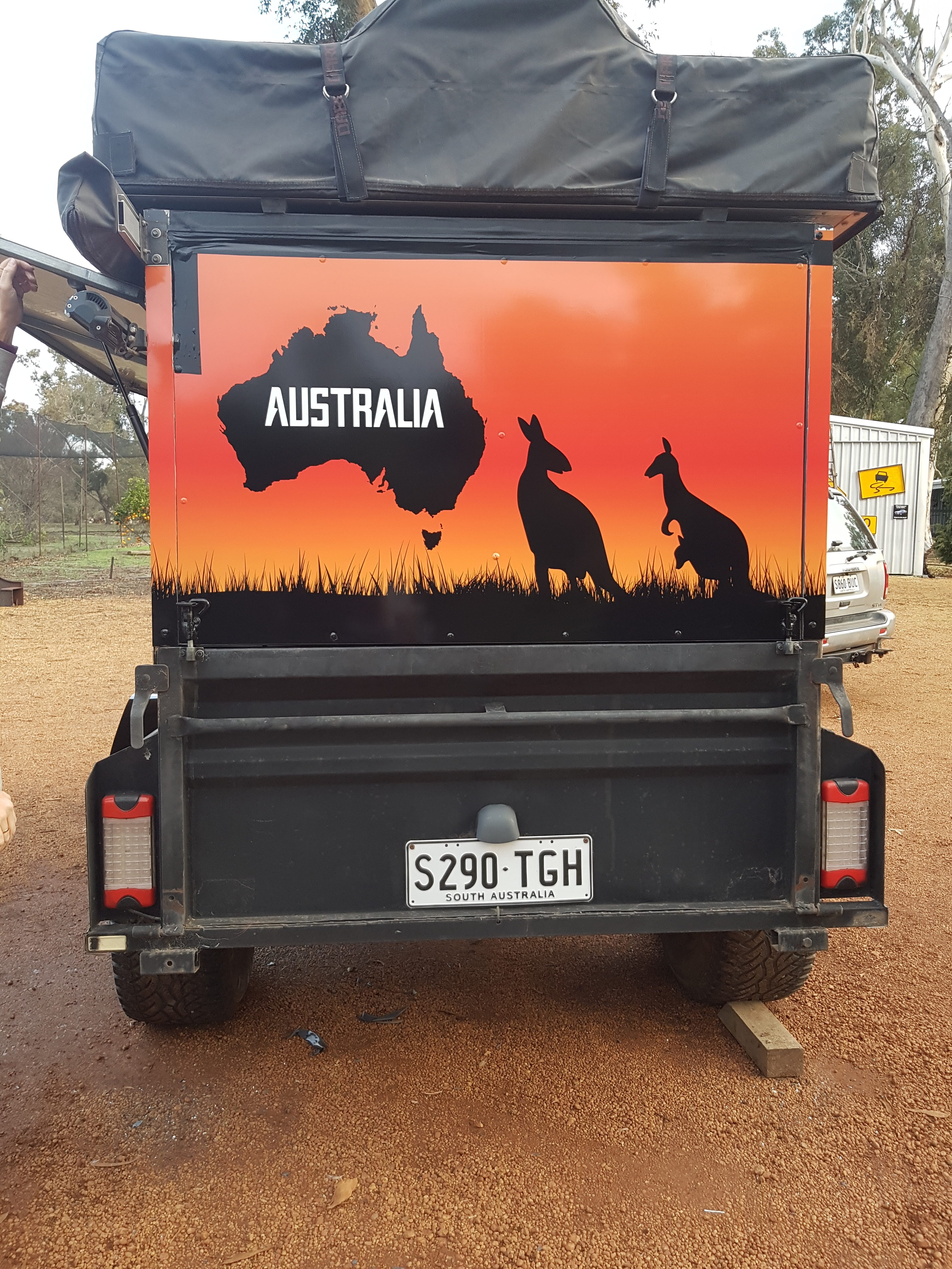 Allez, trêves de bavardage, et hop premier arrêt : la petite ville de toodyay, dans laquelle nous avons fait poser le sticker sur notre trailer ! Et wouah qu’est ce qu’il a de la gueule maintenant !!